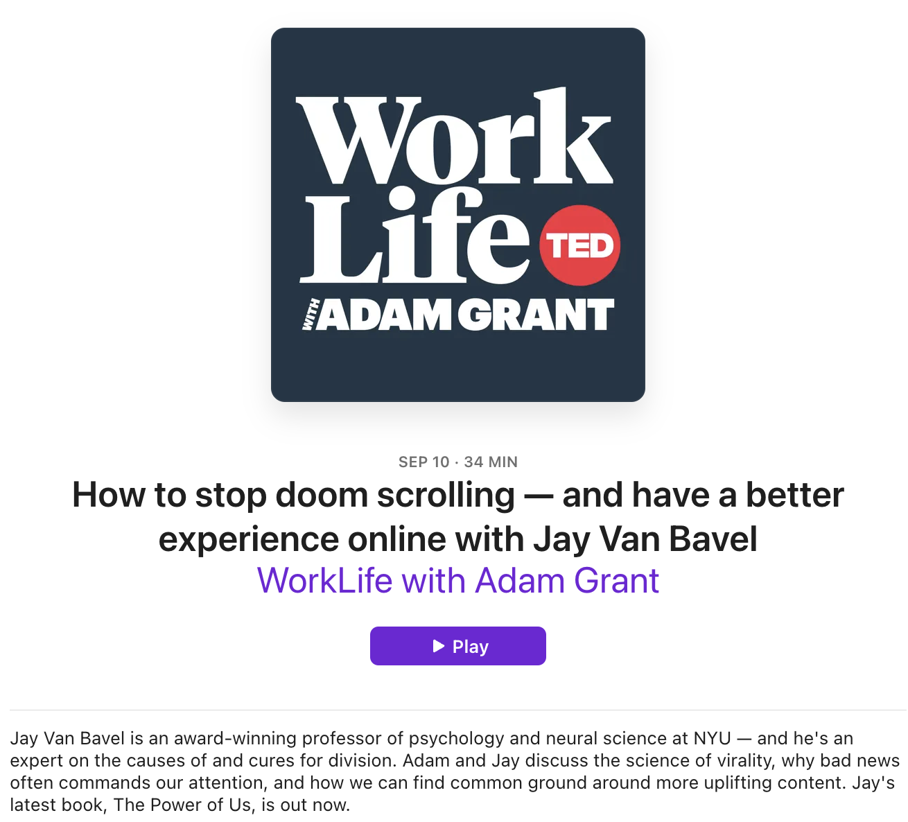 Jay was also a guest on the “Work Life with Adam Grant” podcast, where he discussed our lab’s research the science of virality and how people can find common ground around more uplifting content. You can listen to the podcast here.