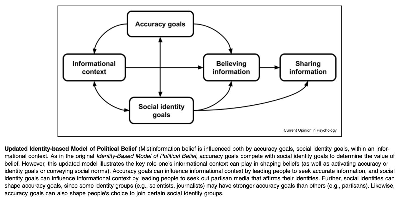 Our Identity-Based Model of Political Belief explains how the push and pull between social identity goals and accuracy goals shapes people’s political beliefs, (biased) information processing, and sharing of (mis)information. According to this model, social identity goals can override accuracy goals, and vice versa. Most people value accuracy much of the time. But when people prioritize social ties and belongingness to their party over accuracy, they align their beliefs with other party members rather than facts.