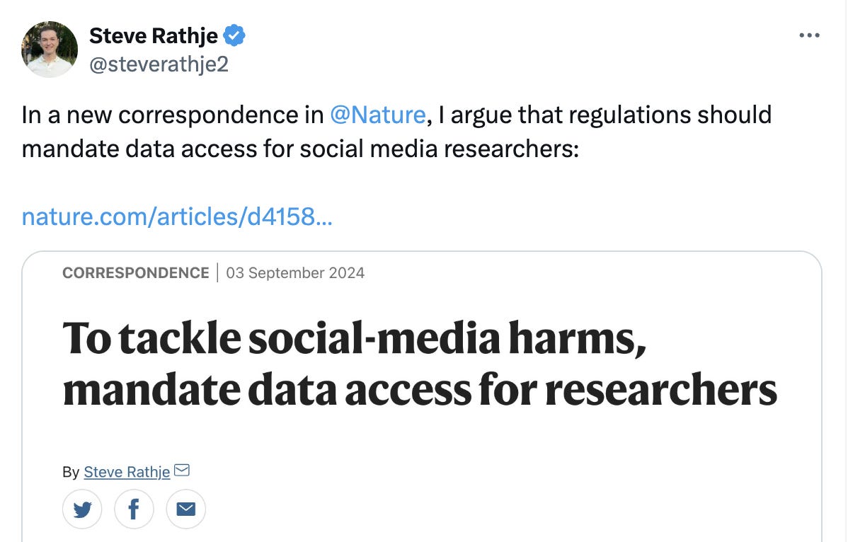 Our postdoc Steve Rathje also recently published a new correspondence in Nature, where he argues in favor of regulations to allow researchers access to social media data from big tech companies. You can read it here.
