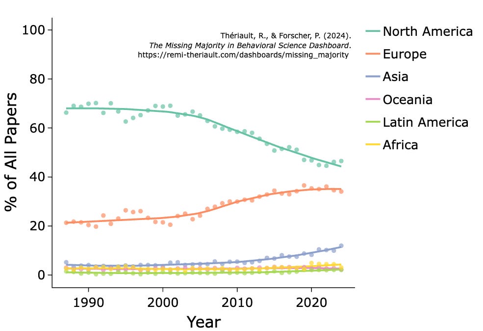 Behavioral science aims to understand and improve the behavior of all humans, yet the Global South remains vastly underrepresented in both participant samples and researchers. This oversight may results in a skewed understanding of behavior. To address this disparity, incoming postdoctoral fellow Rémi Thériault helped develop the Missing Majority Dashboard, which tracks the representation of the lead authors on behavioral science papers from the Global South in 51 behavioral science journals. For more information, please refer to the press release or visit the dashboard directly.