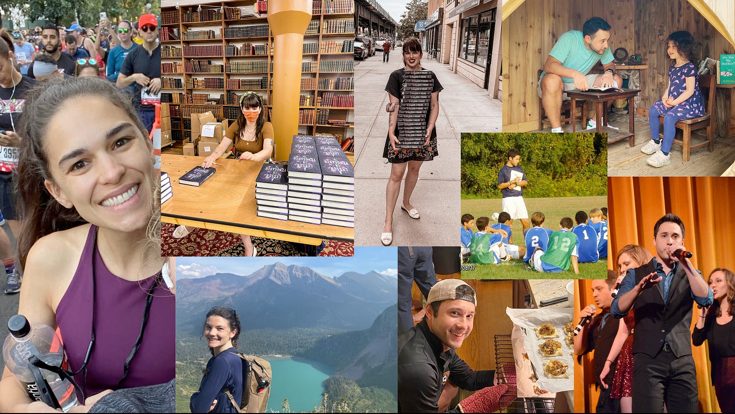 Left—PhD student Anni Sternisko at a race (she’s training for the NY marathon next year); Top center—post-doc and famous YA author Victoria Spring with their newest book, A Lesson in Vengeance; Right—former PhD student and research affiliate Diego Reinero being an awesome uncle, coaching soccer, cooking, and singing acapella; Bottom middle—lab manager Katie Brown hiking in the Montana wilderness!