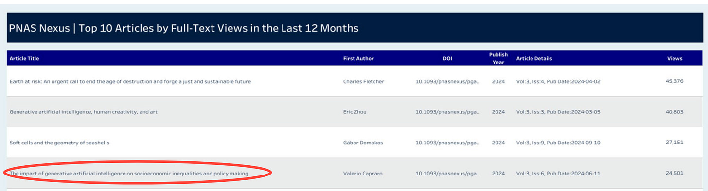 Our paper “The impact of generative artificial intelligence on socioeconomic inequalities and policy making”, led by our collaborator Valerio Caprero, is the 4th most read paper on PNAS Nexus for this year! If you want to read the article, you can do so here.